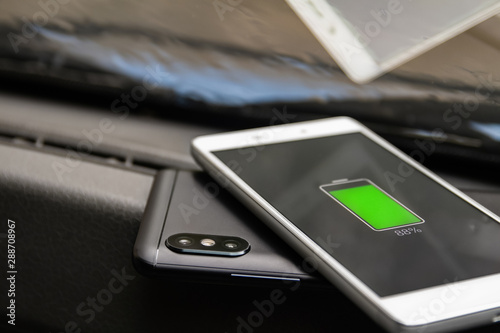 Phone battery wireless charge sharing technology. Wireless charge sharing smartphone in the car in rainy weather