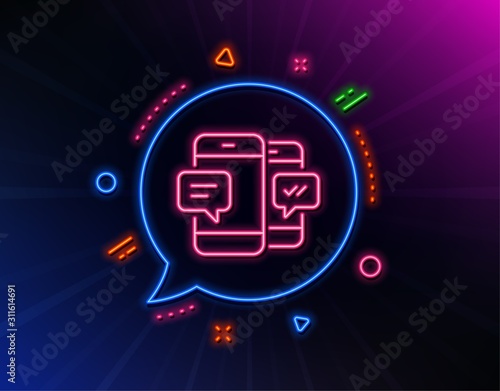 Phone Message line icon. Neon laser lights. Mobile chat sign. Conversation or SMS symbol. Glow laser speech bubble. Neon lights chat bubble. Banner badge with smartphone SMS icon. Vector