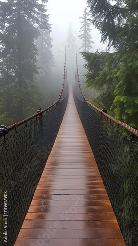 Phone wallpaper: wet suspension bridge surrounded by dense fog that adds to its mystery.