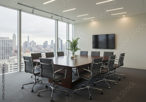 Photo A Modern Conference Room Interior with City View and Black Chairs