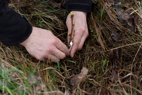 photo male gardener grafting a new cherry variety and holding the grafted branch