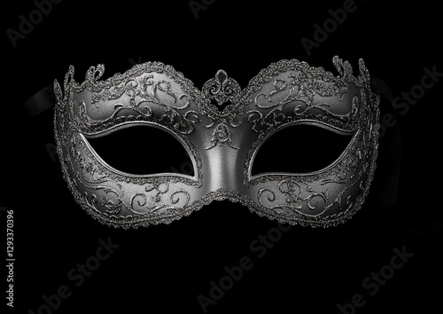 Photo of a black and silver masquerade mask on a solid background, representing mystery for an elegant event, stock photo.
