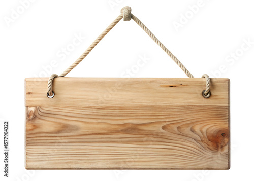 Photo of a blank wooden sign hangs by a rope, offering a rustic and natural template for displaying messages or advertisements isolated on transparent background