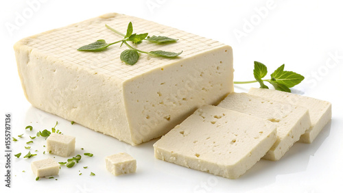 Photo of a block of firm tofu and several slices are arranged with fresh mint and small tofu cubes, isolated on white background