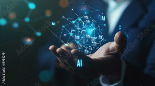 Photo of a Businessman holding a digital icon depicting artificial intelligence with a circuit board connection in his hand on a dark background, with the text "AI" written in t