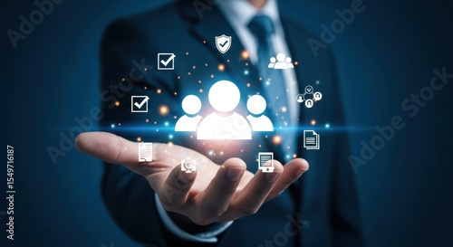 Photo of a businessmans hand shows a glowing holographic icon of three people representing teamwork, collaboration, and community