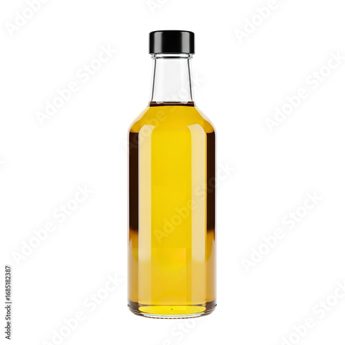 Photo of a clear glass bottle filled with golden yellow liquid, possibly oil or juice, with a black cap, isolated on a transparent background, showcasing its simple and elegant design