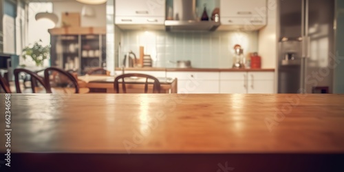 photo of a kitchen with a wooden table with a blur effect behind it. generative AI