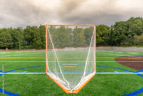 Photo of a lacrosse goal on a empty green synthetic turf field.