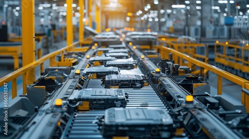 Photo of a modern factory for the production of car battery cells on a conveyor belt, depicting the electronic industry concept