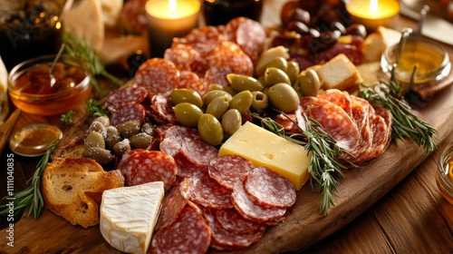 photo, rustic, charcuterie, board, adorned, array, artisanal, cheese, cured, meat, olive, crusty, bread, slice, centered, soft, candlelight, casting, cosy, glow, widener, drizzle, honey, sprig, rosemary, elegant, touch