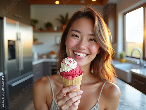 photo of a stunning young woman in her mid-twenties with a fit and toned physique, sporting a bright and cheerful smile, indulging in a decadent scoop of creamy ice cream in a modern