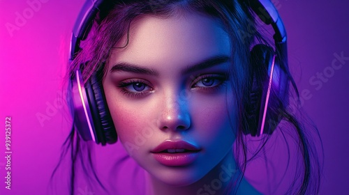 woman, purple, earphones, photo, music, listening, detail, realism, expression, figure, background, composition, visual, technology, ambience, style, minimal, draft, creativity, headset, listen, beauty, face, earphones, people, person, sound, audio, dj, lady, hair, fashion, mp3, streaming, earphones, model, glamour, make-up, make-up, lip, eye, cosmetic, head, coiffure, pink, elegance