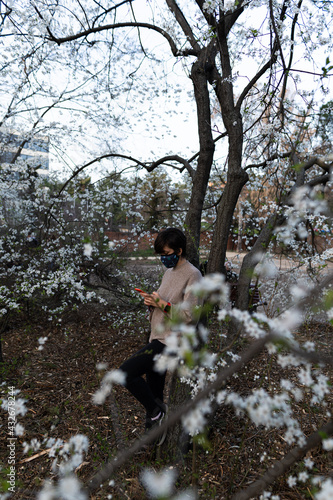Photo of an attractive young female using her phone and taking pictures of the almond tree blossom in a park in Madrid