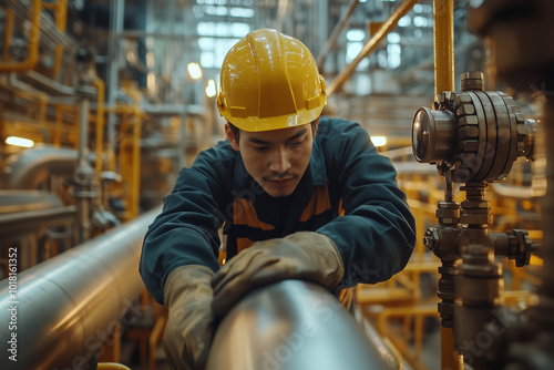 Photo of an industrial worker in a yellow helmet working on an oil and gas production line, connecting pipes. the worker is checking the raw equipment.