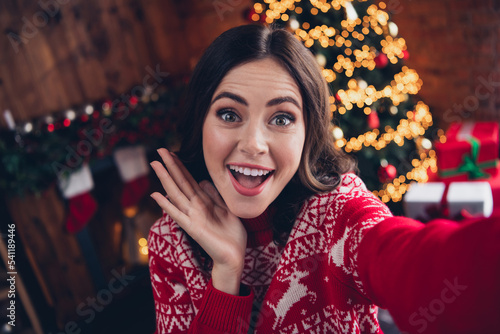 Photo of astonished cheerful girl take selfie toothy smile enjoy christmastime fairy apartment indoors