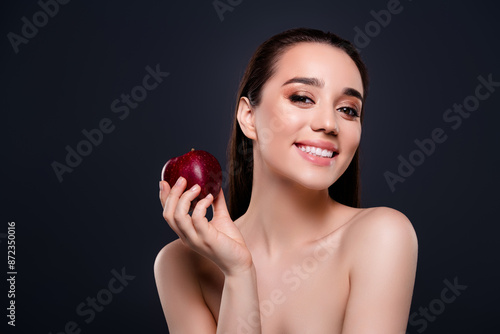 Photo of attractive girl lady toothy smiling hold fresh apple isolated dark color background