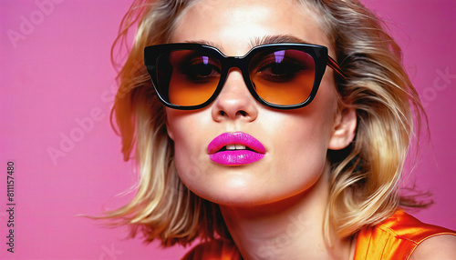 photo of beautiful woman with blonde hair and style sunglasses standing against pink background, generative AI