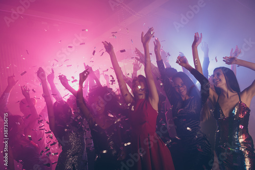 Photo of big company many fancy girls falling glitter raise arms red dress neon bright pink spotlight modern club indoors