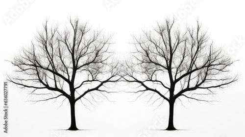 Photo of black twin trees with no leaves against a white backdrop. silhouette concept