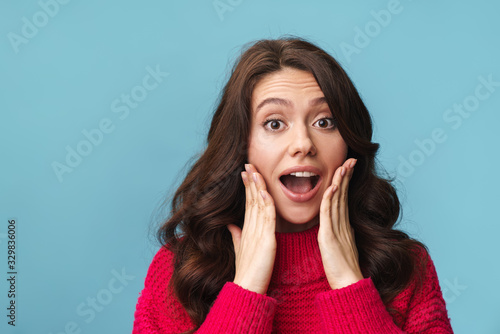 girl, portrait, photo, fun, studio, beautiful, woman, looking, brunette, gorgeous, lady, long, camera, brown, auburn, hair, caucasian, 1, female, background, wall, isolated, young, person, posing, coiffure, content, charming, lovely, girlish, pretty, stylish, blue, alluring, gesticulate, happy, smiling, joyous, pleased, delighted, amazed, screaming