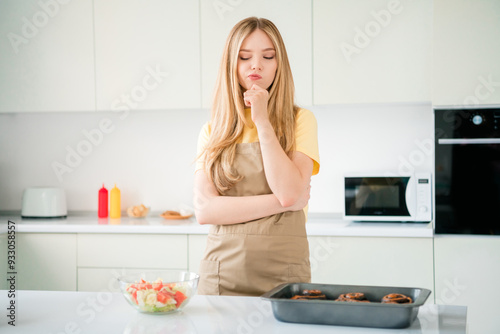 Photo of charming adorable funny girl cooking bakery fresh sweet bun meal hand chin indoors house kitchen