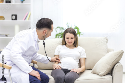 Photo of doctor with stethoscope going to exam the pregnant woman.