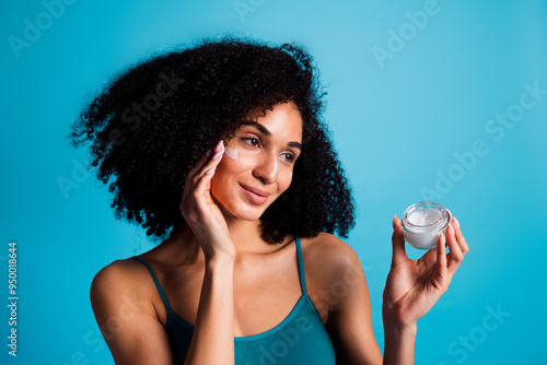 Photo of girl applying cream on face enjoying wear lingerie isolated blue color background