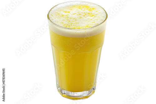 Photo of glass filled with freshly squeezed sugar cane juice, foamy foam, isolated on white background.