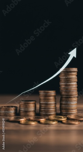 coin, stack, arrow, growth, investment, finance, money, financial, economy, business, wealth, currency, saving, success, market, profit, coin, banking, accumulation, capital, cash, fund, income, increase, return, risk, asset, budget, concept, datum, deposit, diagram, earning, exchange, graph, loan, management, payment, planning, portfolio, rate, revenue, statistic, strategy, trade, value, wooden table, dark background, symbol