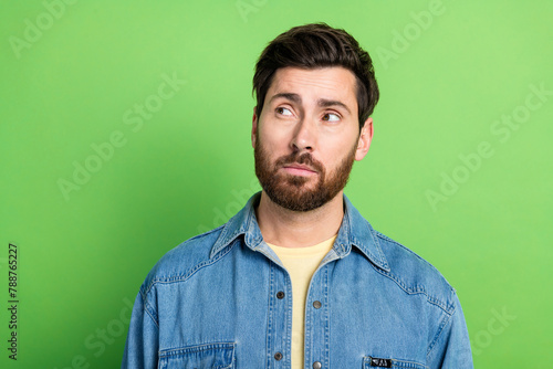 Photo of good mood thoughtful guy wear denim jacket looking empty space isolated green color background