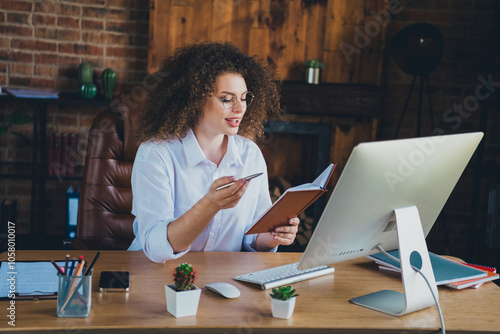 Photo of lovely curly young lady read notebook video call dressed formalwear business manager comfortable startup office room interior