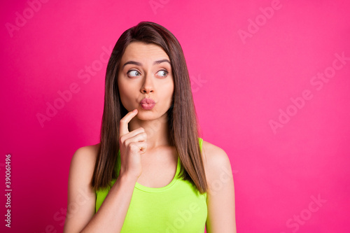Photo of lovely funny girl finger face lips look side empty space wear green singlet isolated bright pink color background
