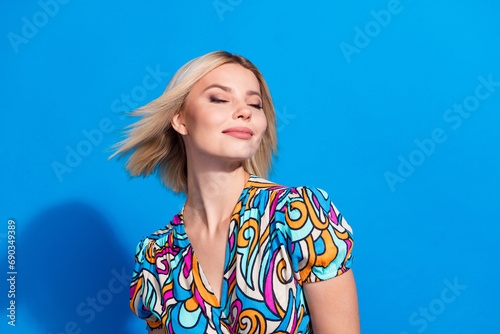 Photo of lovely peaceful lady closed eyes flying hairstyle empty space ad isolated on blue color background
