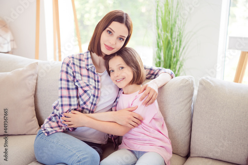 Photo of positive happy people siblings smile good mood hug sit sofa indoors inside house home apartment