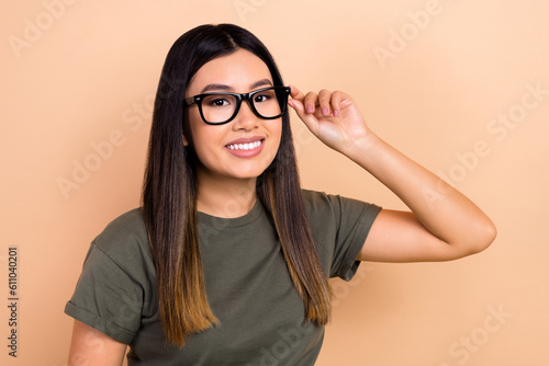 Photo of positive intelligent indonesian person beaming smile hand touch glasses isolated on beige color background