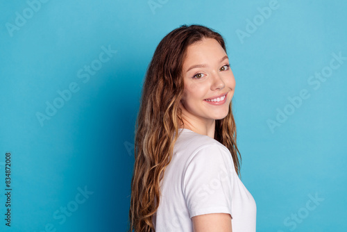 Photo of pretty cheerful cute girl wear white stylish pajama empty space isolated on blue color background