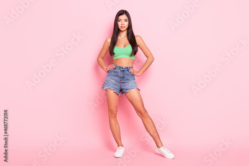 Photo of pretty shiny young woman hair dressed green singlet smiling arms waist isolated pink color background