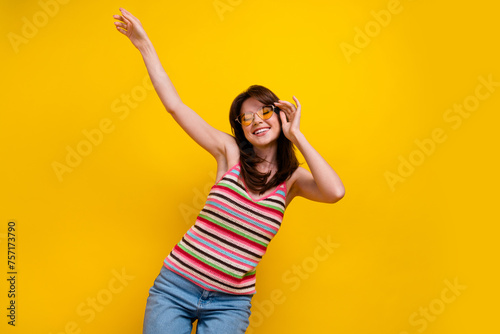 Photo of satisfied adorable girl with stylish hairdo wear striped tank touch glasses dancing in club isolated on yellow color background