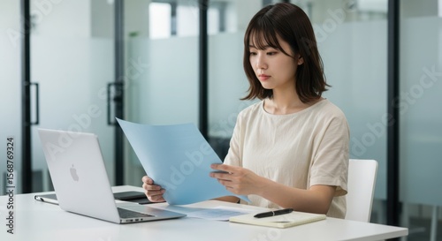 business, woman, office, laptop, paperwork, document, work, concentrated, focused, professional, asian, female, young, adult, desk, table, analysis, reading, review, information, datum, report, meeting, corporate, career, employment, modern, interior, indoor, person, 1, people, smart, intelligent, cognition