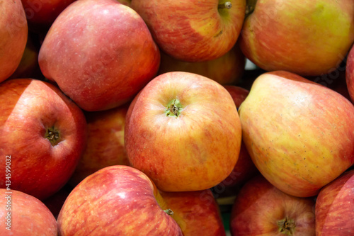 Photo on the theme of fruit. Boxes of juicy apples in the supermarket.
