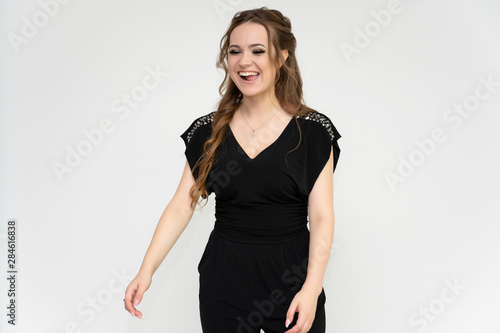 Photo portrait above the knee of a pretty girl of a brunette woman with long beautiful curly hair on a white background in a black dress. Talking while standing in front of the camera.