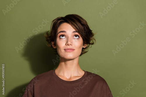 Photo portrait of pretty young girl look up interested empty space dressed stylish brown outfit isolated on khaki color background