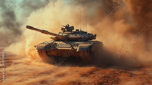 Photo realistic depiction of a tank traveling diagonally, with high detail and sharpness emphasizing its realistic appearance