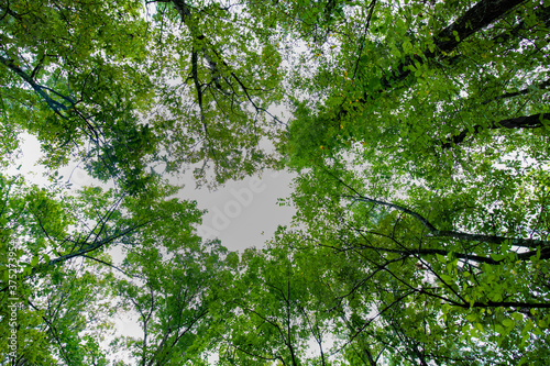 Photograph looking up from forest floor green tree branches and leaves the white sky