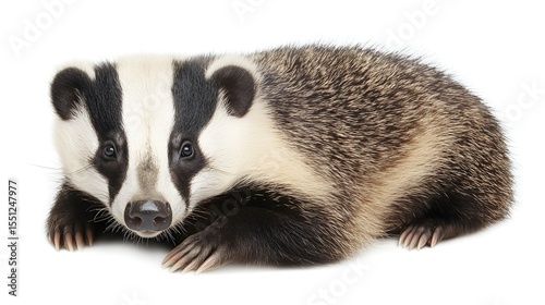 badger, animal, cute, adorable, black, white, fur, paw, closeup, head shot, wildlife, mammal, pet, domestic, relaxed, lying down, resting, portrait, studio shot, glossy, detailed, texture, contrast, light, shadow, monochrome, colours, photo, black-and-white, lying, small animal, furry, head, snout, whisker, hi-res
