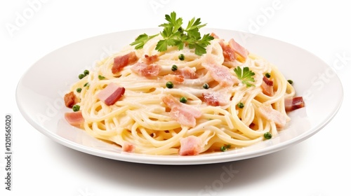 Photograph of A plate of spaghetti carbonara isolated on white