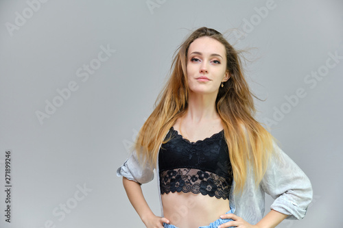 Photograph of a portrait of a beautiful girl woman with long dark flowing hair, satisfied life on a gray background. She stands in front of the camera in different poses with different emotions.