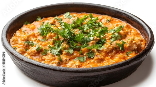 Photograph of a rustic, dark ceramic bowl filled with a chunky, tomato-based minced meat stew.