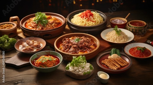 Photograph of a rustic wooden table adorned with a variety of pork noodle dishes, each bowl showcasing a unique regional style, from spicy Sichuan noodles to comforting Taiwanese lu rou fan.